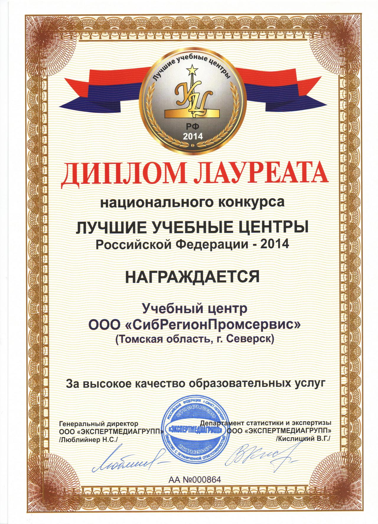 Учебный центр ООО "СибРегионПромсервис" стал лауреатом Национального конкурса "Лучшие учебные центры РФ 2014"